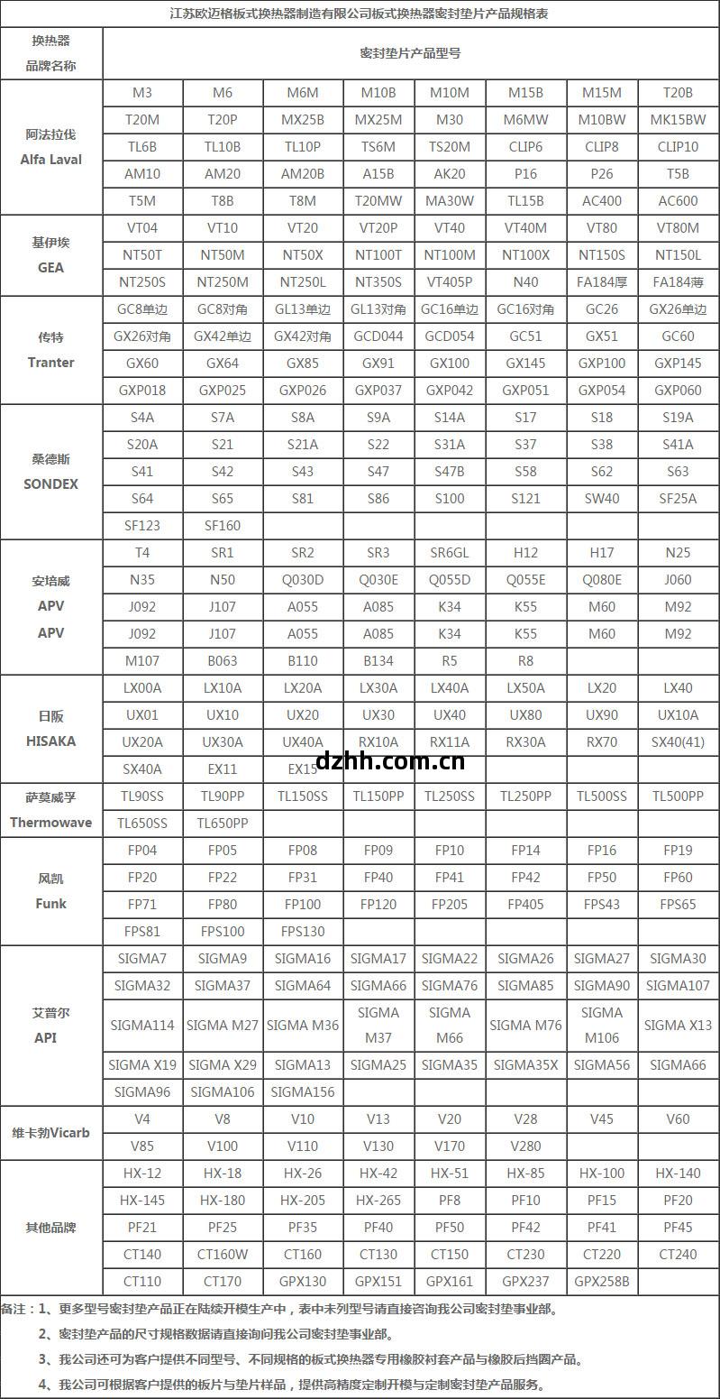 備註:1、多型(xing)號(hao)密封(feng)墊(dian)產(chan)品(pin)正在(zai)陸(lu)續開模(mo)生產(chan)中,表(biao)中未(wei)列型(xing)號(hao)請直(zhi)接咨(zi)詢(xun)我(wo)公(gong)司密封墊(dian)事業(ye)部。 備註:2、密封(feng)墊(dian)產(chan)品(pin)的尺(chi)寸規(gui)格數據請直(zhi)接詢(xun)問我公(gong)司密封墊(dian)事業(ye)部。 備註:3、我公(gong)司還可(ke)為客戶(hu)提供不(bu)同(tong)型(xing)號(hao)、不(bu)同(tong)規格的(de)板(ban)式換熱(re)器(qi)專(zhuan)用(yong)橡膠襯(chen)套產(chan)品(pin)與橡膠後(hou)擋圈產(chan)品(pin)。 備註:4、我公(gong)司可(ke)根(gen)據(ju)客戶(hu)提供的板(ban)片與(yu)墊(dian)片(pian)樣品(pin),提供高(gao)精(jing)度定(ding)制開模(mo)與(yu)定(ding)制密封(feng)墊(dian)產(chan)品(pin)服務。 |