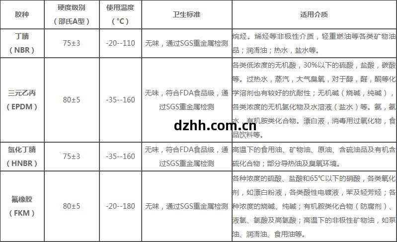 80±5 | -35--160 | 無(wu)味,符(fu)合(he)FDA食(shi)品(pin)級,通過SGS重金(jin)屬(shu)檢測 | 各類低濃(nong)度的(de)無(wu)機酸,30%以(yi)下的(de)硫酸,鹽(yan)酸,碳酸等(deng)。過熱(re)水,蒸(zheng)汽(qi),大(da)氣臭(chou)氧(yang),對於醇,醛(quan),酮等(deng)化(hua)學(xue)溶(rong)劑也(ye)有(you)較好(hao)的(de)抗耐性(xing);無機(ji)堿(燒堿,純堿),各(ge)類濃度的(de)無(wu)機氯化(hua)物及水溶(rong)液(鹽(yan)水)等(deng)。氨(an),氨(an)水,有(you)機胺(an)類化合(he)物。漂白(bai)液,消毒用過氧(yang)化(hua)物(wu),食(shi)品(pin)飲(yin)料(liao)等(deng)。 |